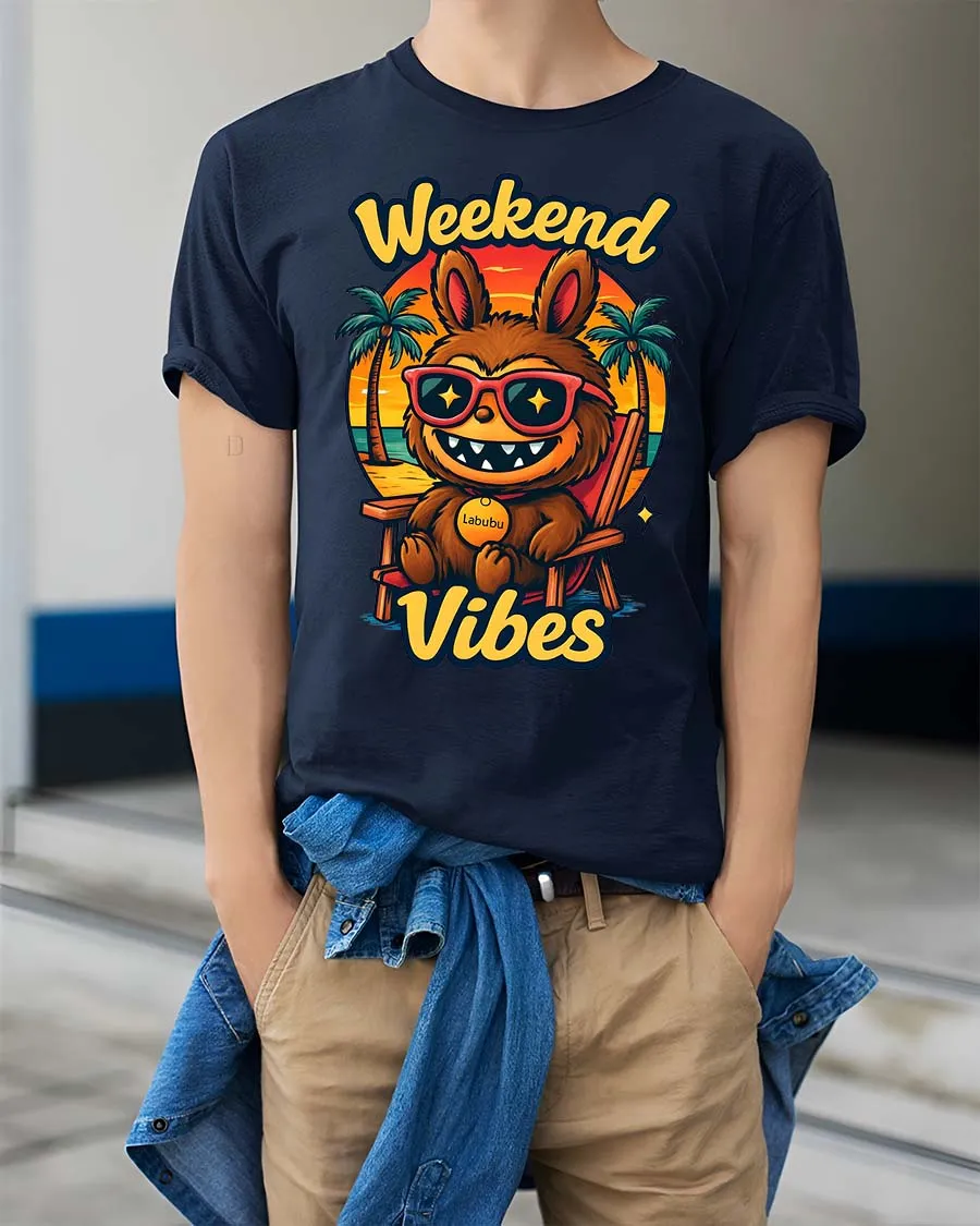 Weekend Vibes Funny Beach Cartoon Character t-shirt Soft works well with shorts jeans or layered streetwear fashion.