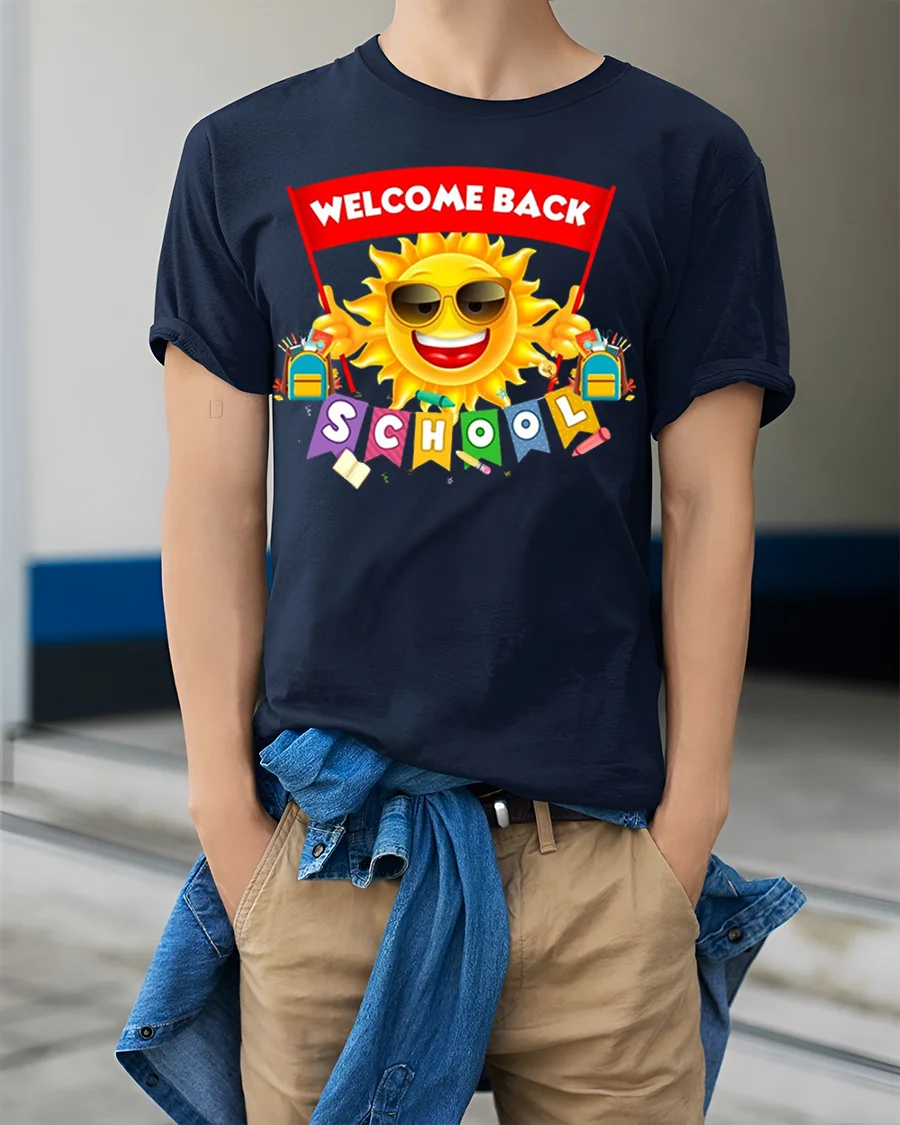 Welcome Back To School Sun Fun T-Shirt - model wearing navy shirt, hands in pockets
