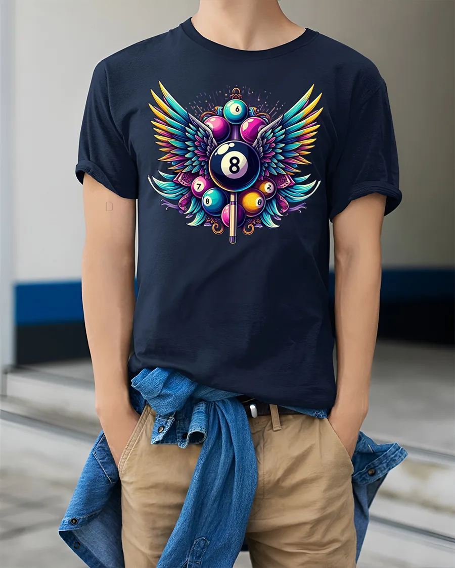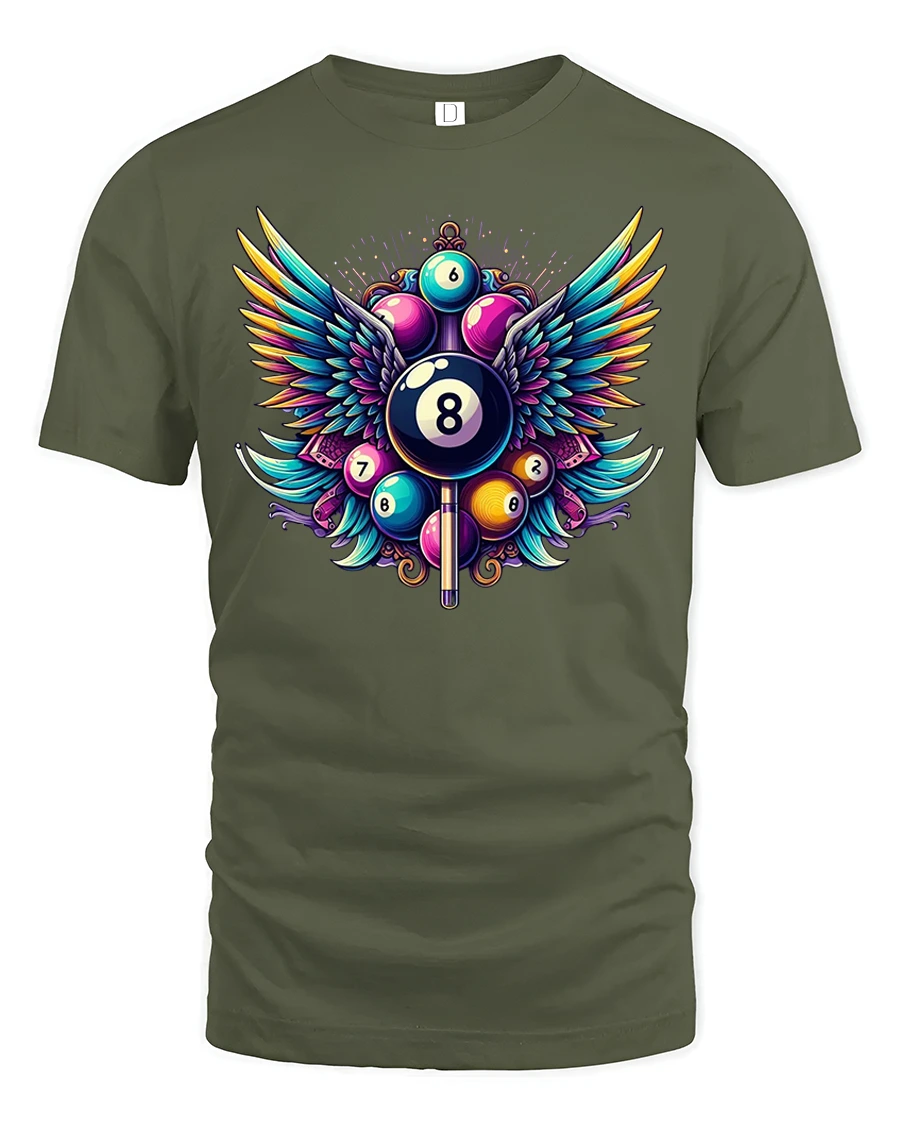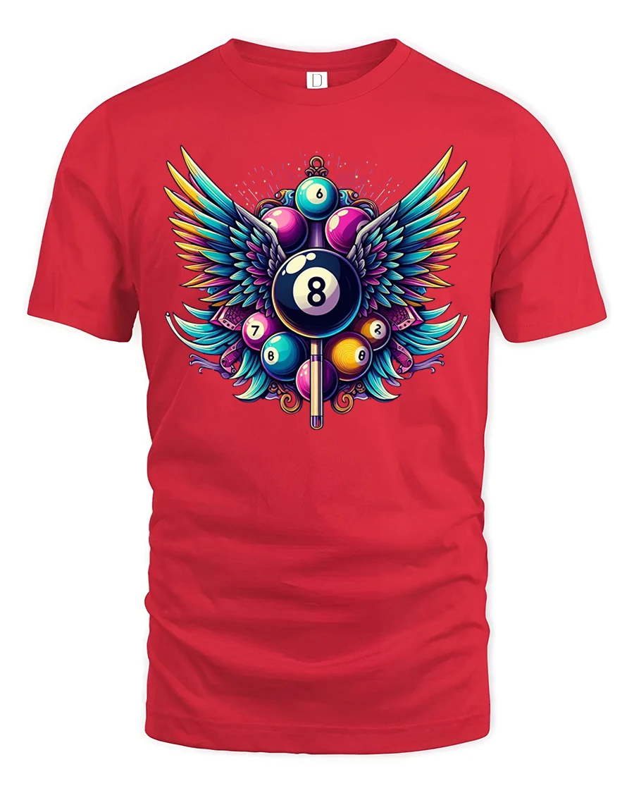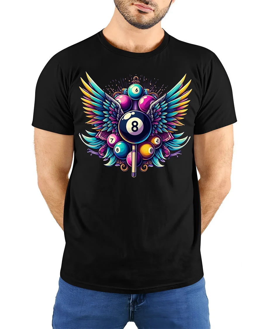 Winged 8 Ball Pool Legend Color Splash Graphic T-Shirt is a bold, colorful tribute to the world of billiards and street style.