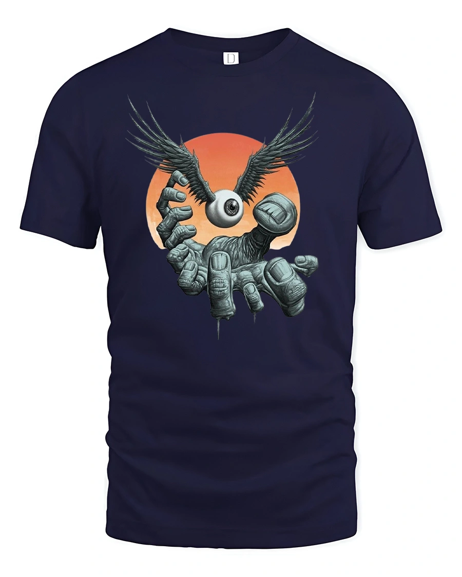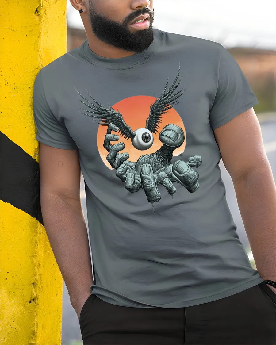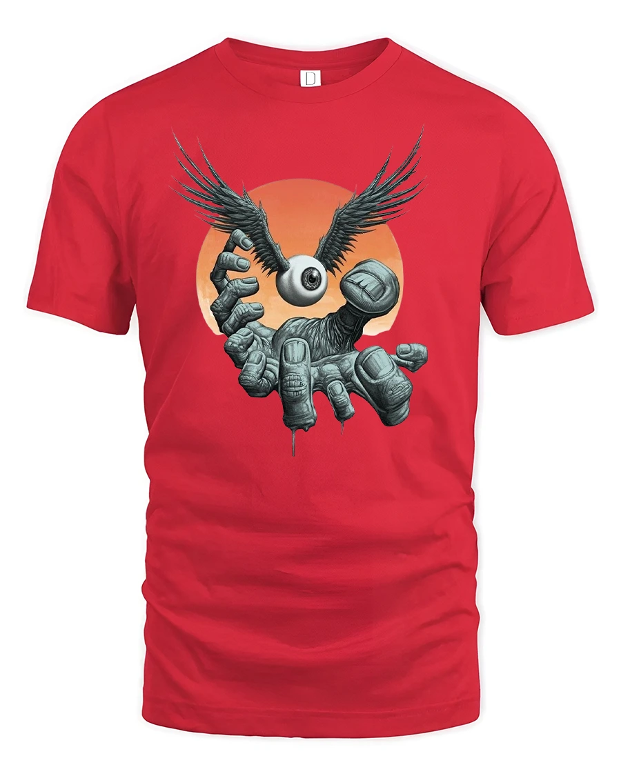 Winged Eyeball Hand T-Shirt Surreal Gothic Graphic Tee is the perfect choice for fans of gothic art, horror-inspired designs, and surreal fantasy style. Featuring a dark hand reaching up to release a winged eyeball against a dramatic sunset backdrop, this shirt captures eerie imagination and bold creativity.