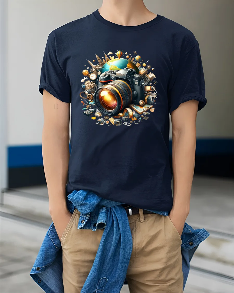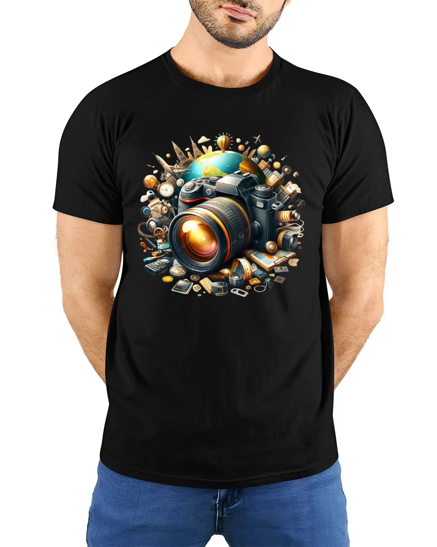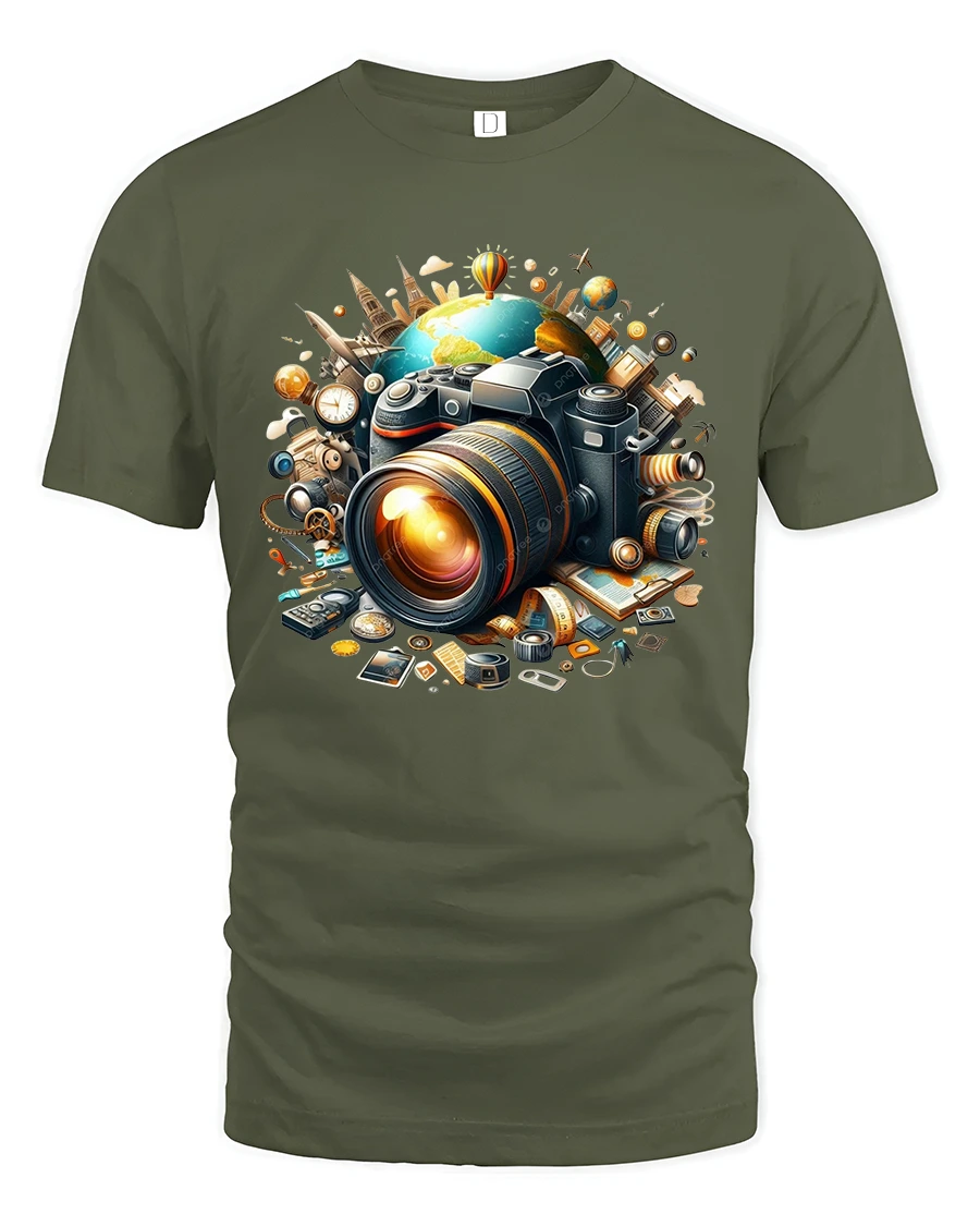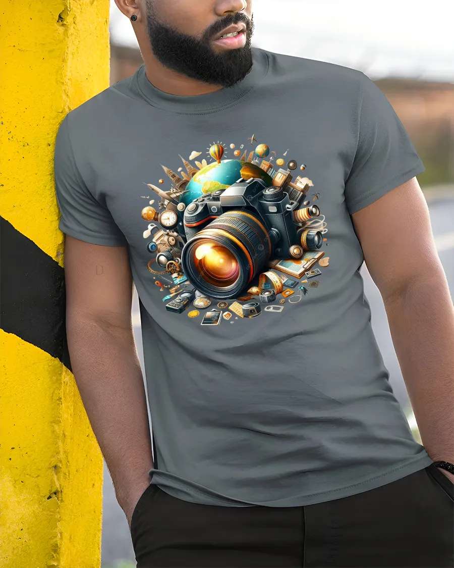 Perfect as a fun everyday tee or a stylish choice for any photography enthusiast, it adds personality and wanderlust to any outfit. With its detailed illustration and creative composition, this design makes a bold statement about your passion for the world and the stories captured through a camera lens.