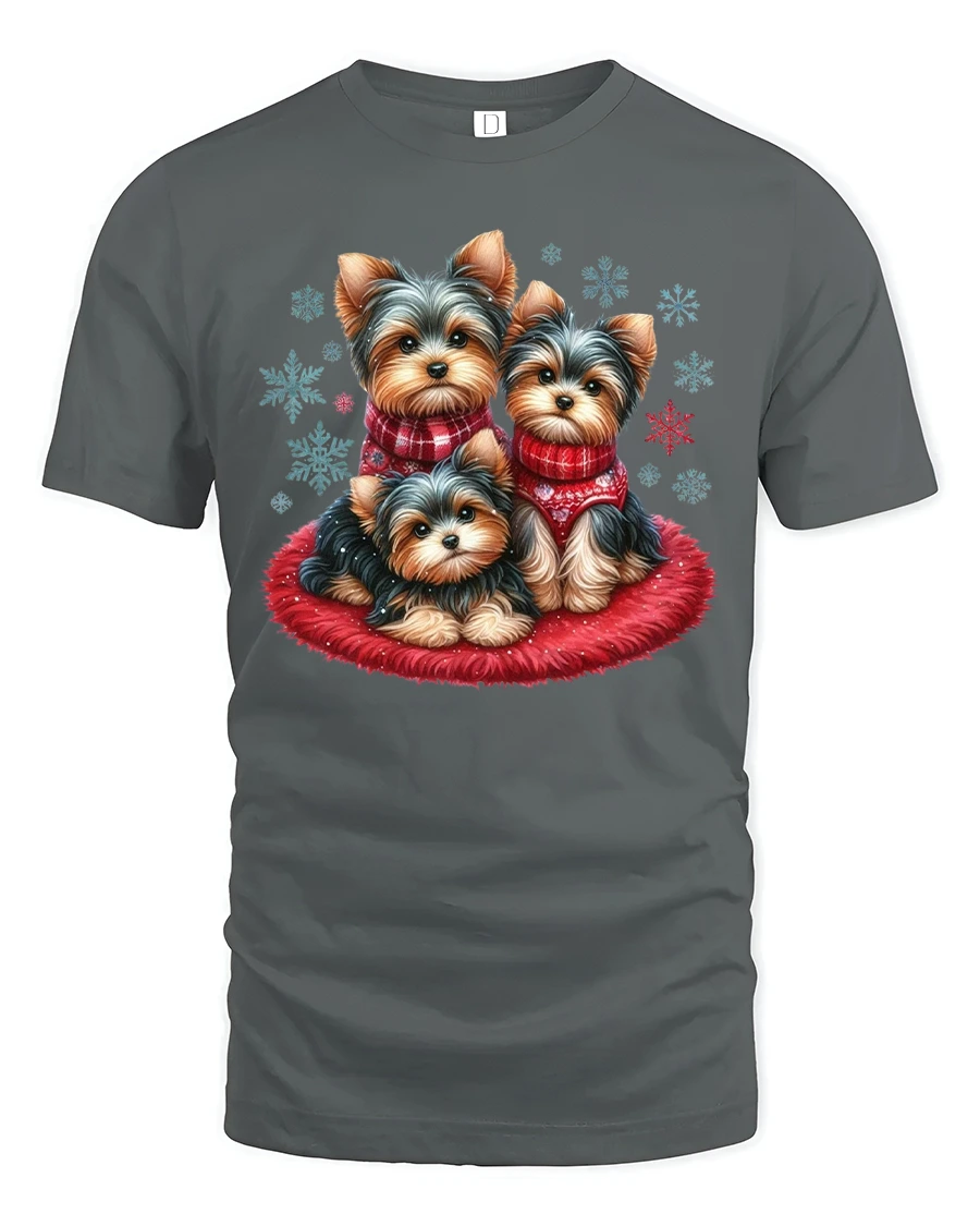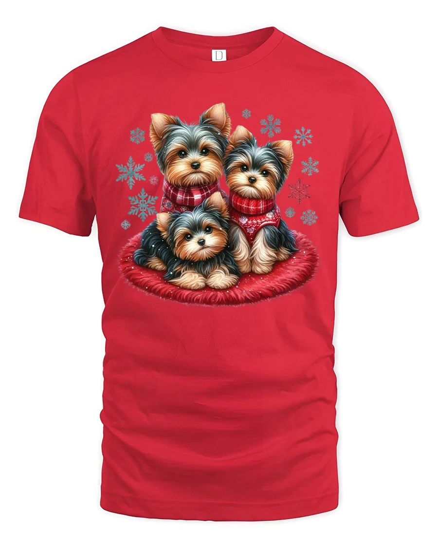 With its vibrant colors and heartwarming composition, this tee is perfect for spreading cheer during gatherings, casual outings, or cozy nights by the fire. The detailed artwork showcases the lovable personality of Yorkshire Terriers, making it a standout piece for dog lovers who enjoy celebrating the season in style. Whether worn throughout winter or just during Christmas festivities, it adds a joyful touch to any outfit.