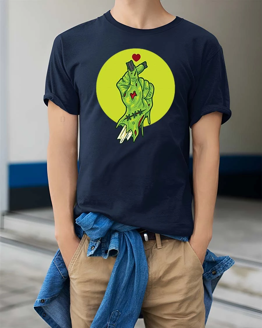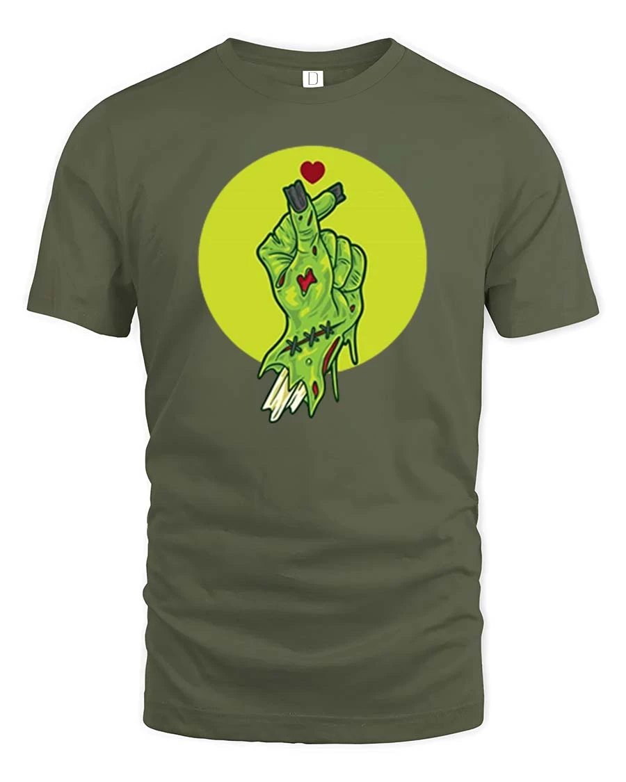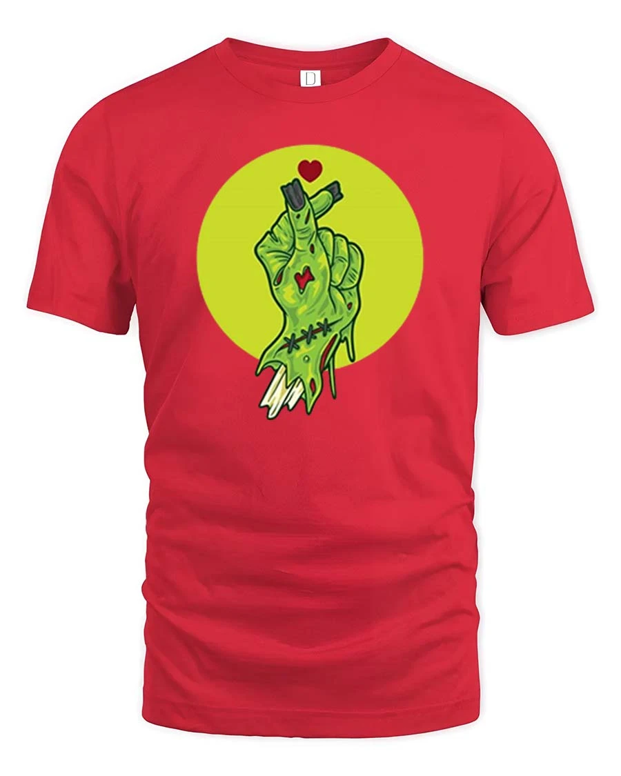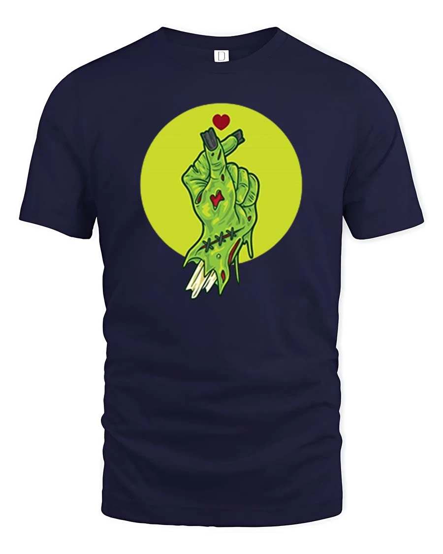 Zombie Hand Heart Gesture Horror Graphic Halloween T-Shirt features a bold spooky design that blends creepy style with playful symbolism.